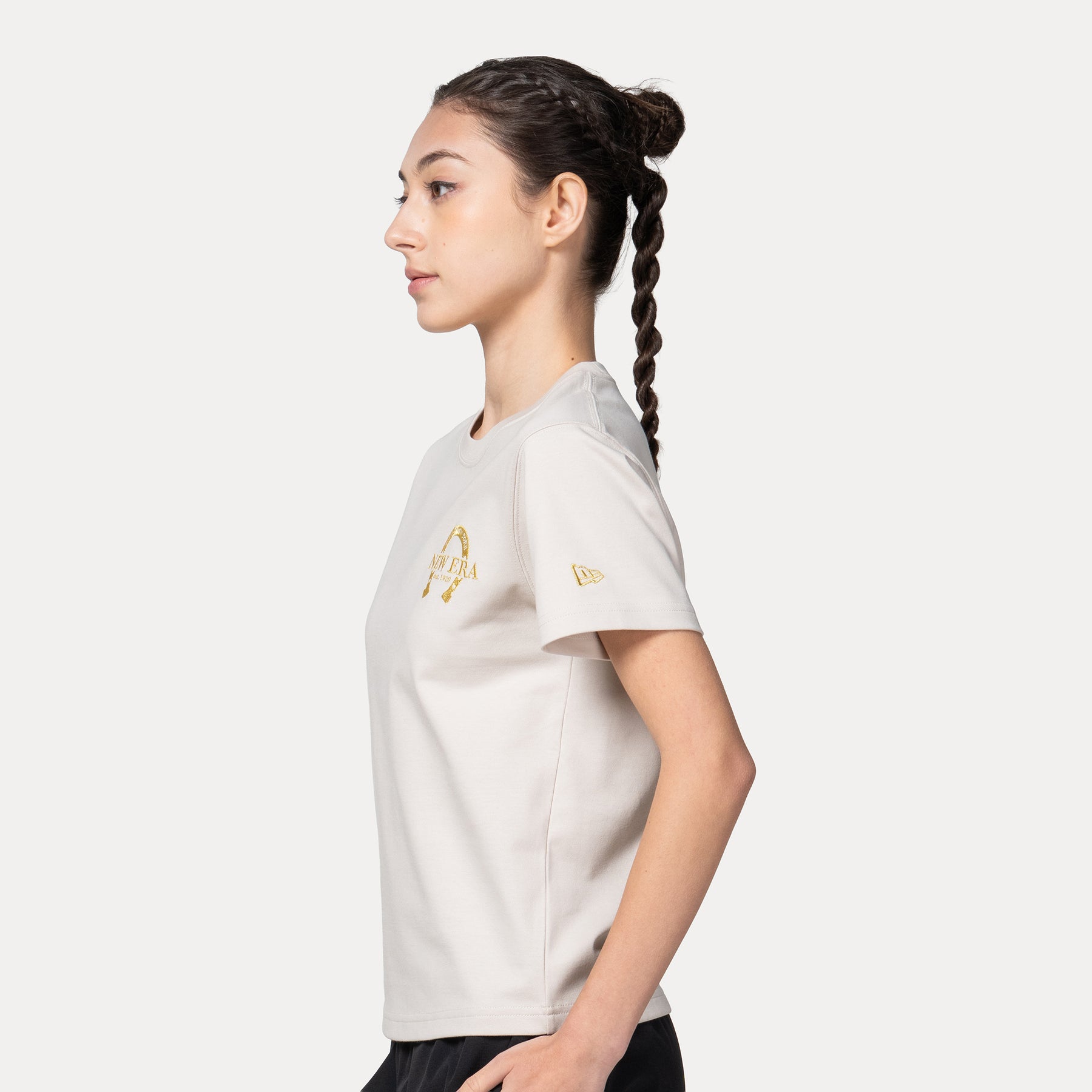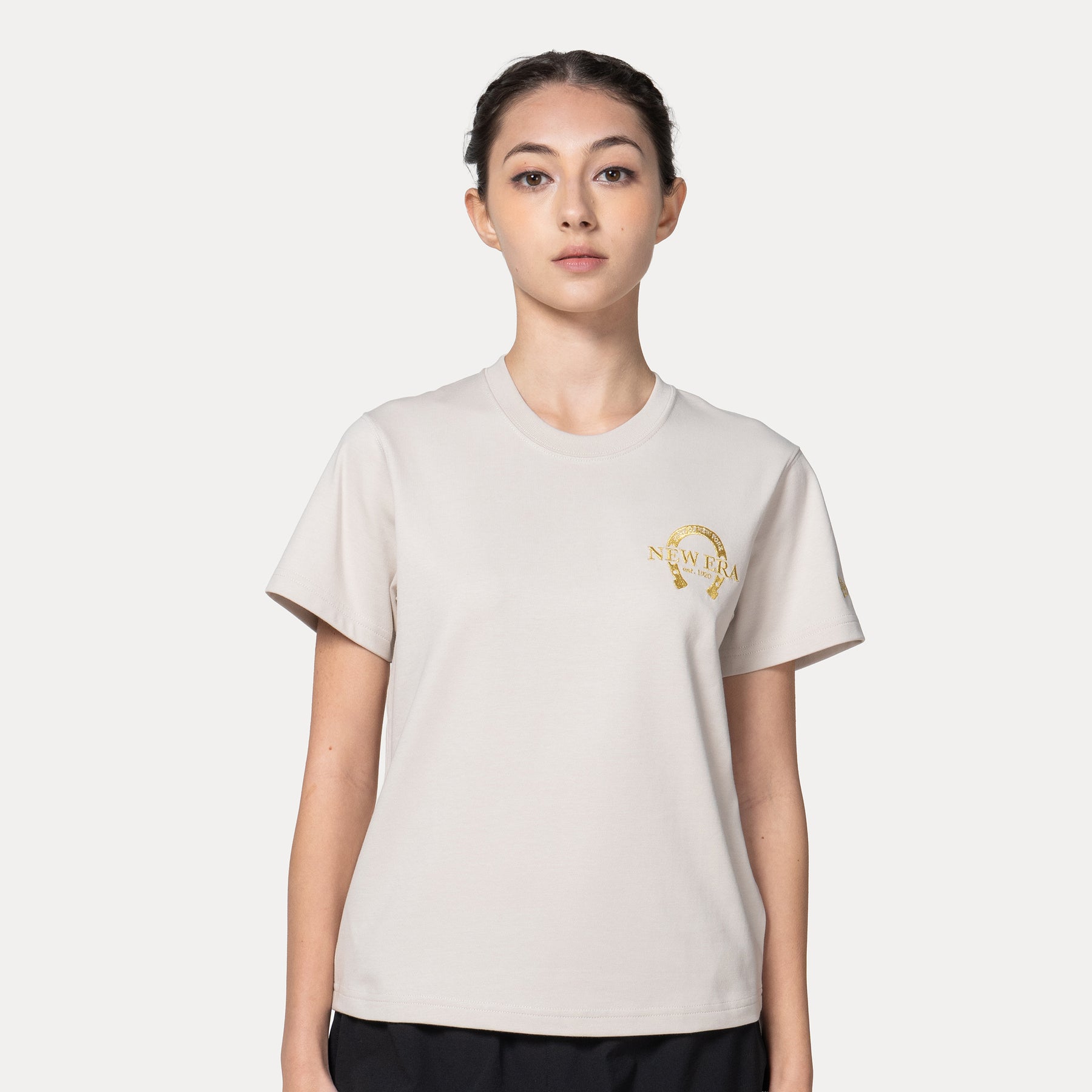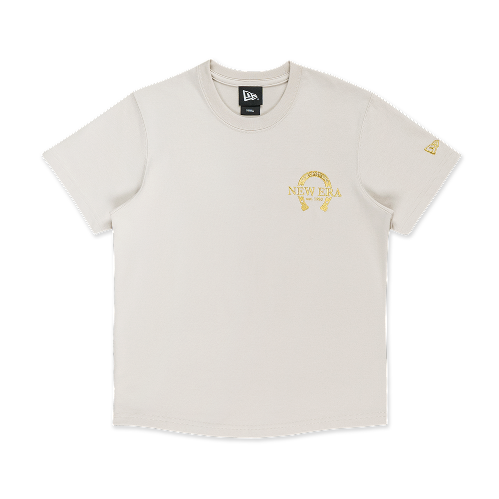 - Rendered in Stone, the design fuses a “NEW ERA est.1920” wordmark with a branded horseshoe logo on the left chest.