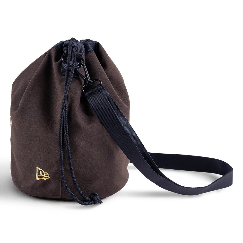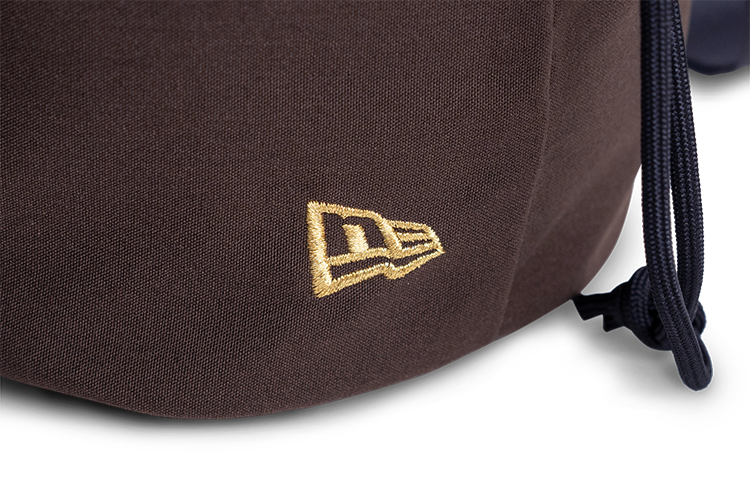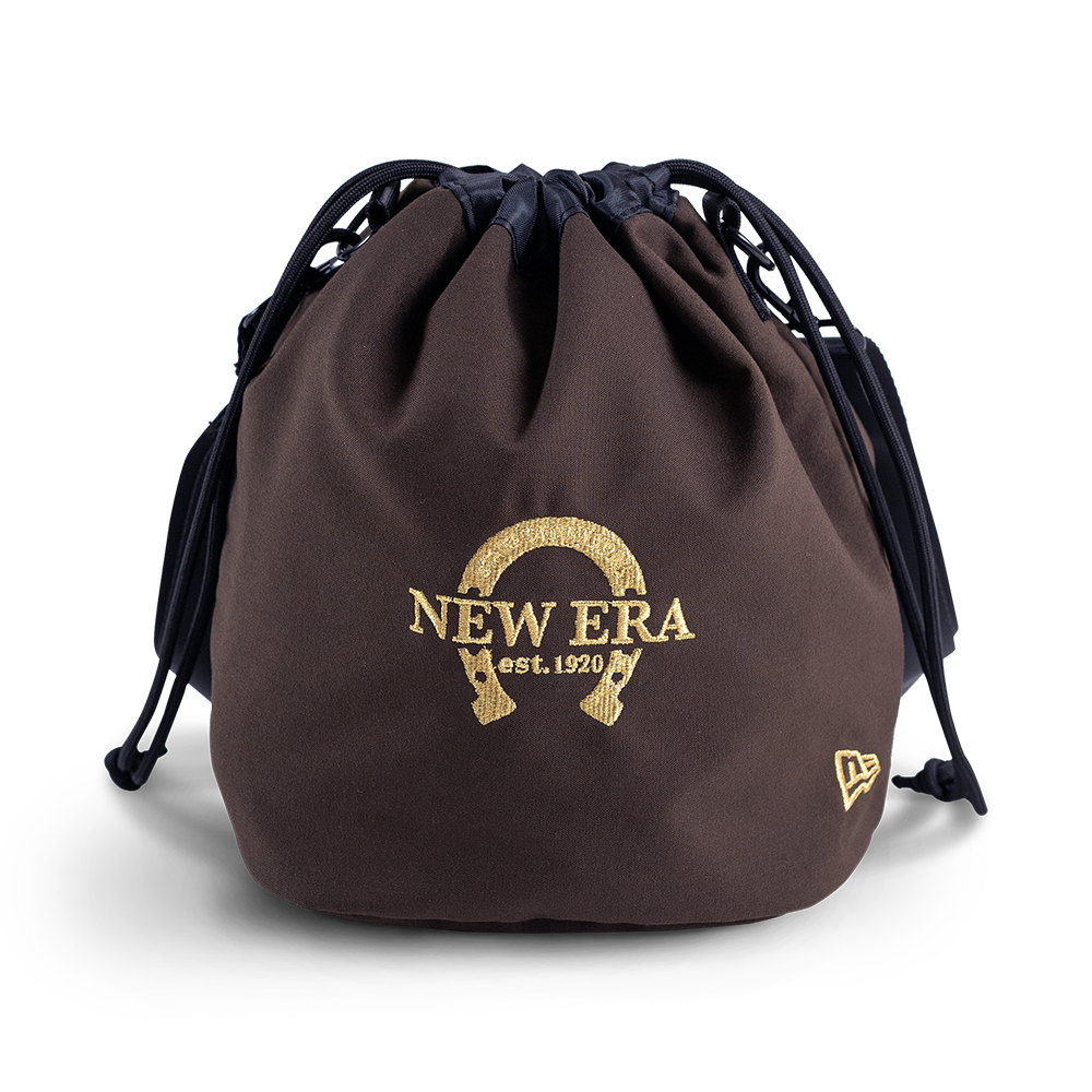- Rendered in Walnut, the design fuses a “NEW ERA est.1920” wordmark with a branded horseshoe logo on the front.