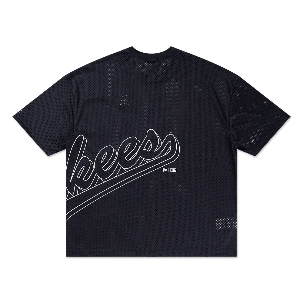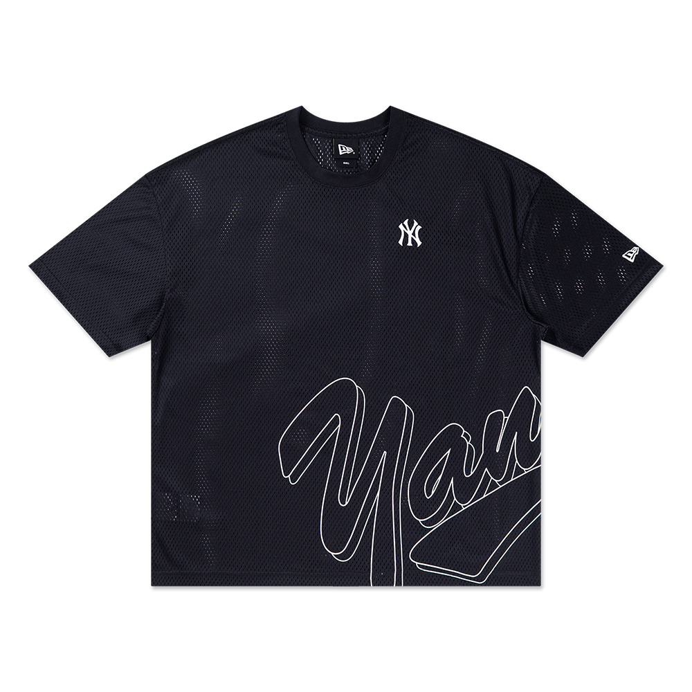 - Rendered in black, the mesh tee features a Yankees wordmark printed across the front and rear bottom.
